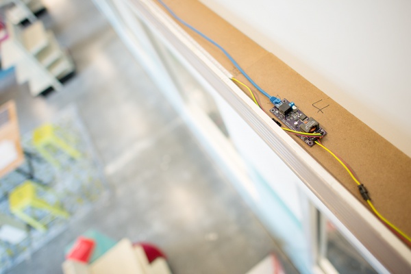 Power cables and an extra long mini-USB cable from the FadeCandy run from the controller board through the ledge, through a wall-mounted cable keeper and attach to the Raspberry Pi and power supply.
