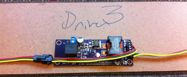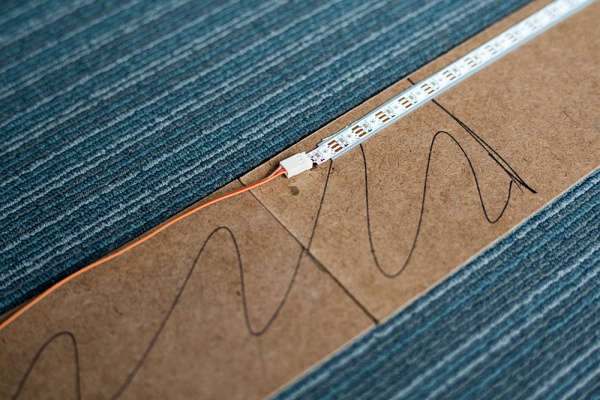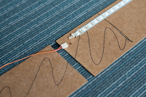 With everything marked and the LED strips prepped, it was time to adhere the strips and drivers to the hardboard with double-sided tape. Ribbon cable was used to connect the portions of LEDs that didn’t need to be disassembled.