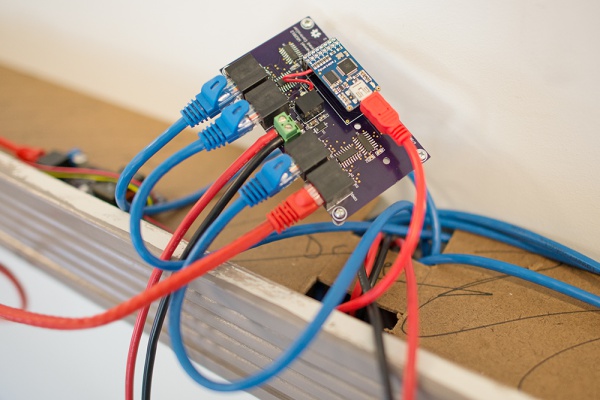 Only one FadeCandy was used to control the 480 LEDs in the CandyBar. It lives atop the OctoController board from danjuliodesigns.com, and communicates to the Driver boards over varying lengths of Ethernet cables. The Ethernet cables provide both power and communication to each pair of LED strips through the DualDriver boards as well as ESD protection.