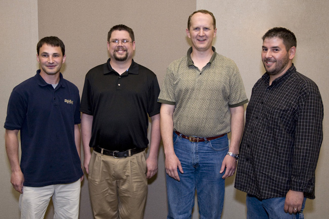 Photo Insert: During a reception held May 24, four Digi-Key employees were recognized for successfully completing Digi-Key's Technical Scholarship program and receiving Electronics Technology degrees from Northland Community and Technical College (NCTC) in Thief River Falls, Minn. Since graduating, these four Digi-Key employees have also been promoted to technical support specialist positions within Digi-Key's Technical Support Division. The recipients of the Electronics Technology degree, pictured right, are (from left to right) Mike Wilebski, Brandon Page, Bruce Holte, and John Kieffer.