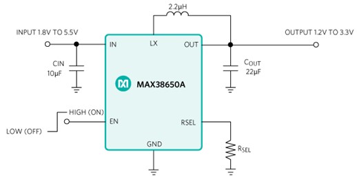 - Single resistor adjustable VOUT from 1.2 V to 3.3 V (MAX38650A)