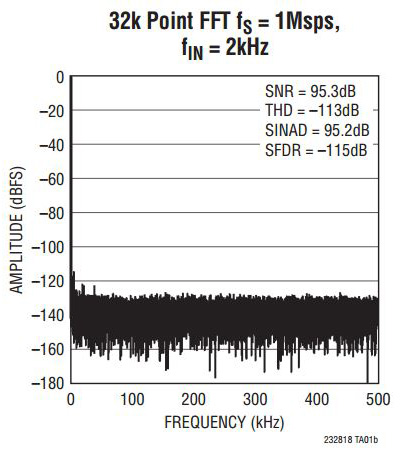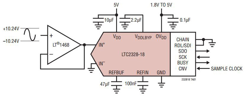 Linear Technology's LTC2328-18 is a low noise, high-speed 18-bit successive approximation register (SAR) ADC with pseudo-differential inputs. Operating from a single 5 V supply, the LTC2328-18 has a ±10.24 V true-bipolar input range, making it ideal for high-voltage applications which require a wide dynamic range. The LTC2328-18 achieves ±5 LSB INL maximum, no missing codes at 18 bits with 95 dB SNR.