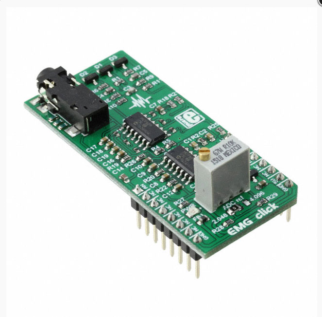 The MIKROE-2621 EMG click from MikroElektronika measures the electrical activity produced by the skeletal muscles. It features the Microchip MCP609 operational amplifier as well as the Maxim MAX6106 micropower voltage reference. EMG click is designed to run on a 5 V power supply and it has an analog output (AN pin). The EMG click is a prototyping tool, not a medical-grade device, so it is not to be used to diagnose patients. Electromyography or EMG is a diagnostic technique for measuring the electrical activity of muscles. It is often used to diagnose the health of these muscles and the neurons that control them. These neurons are called motor neurons. They transmit electrical signals and the muscles contract when this happens. The onboard 3.5 mm audio jack is used to connect cables/electrodes to the click board. The electrode collects voltage from the skin (few millivolts) and the signal from the jack is amplified and filtered. Therefore, EMG click can be divided into seven blocks.