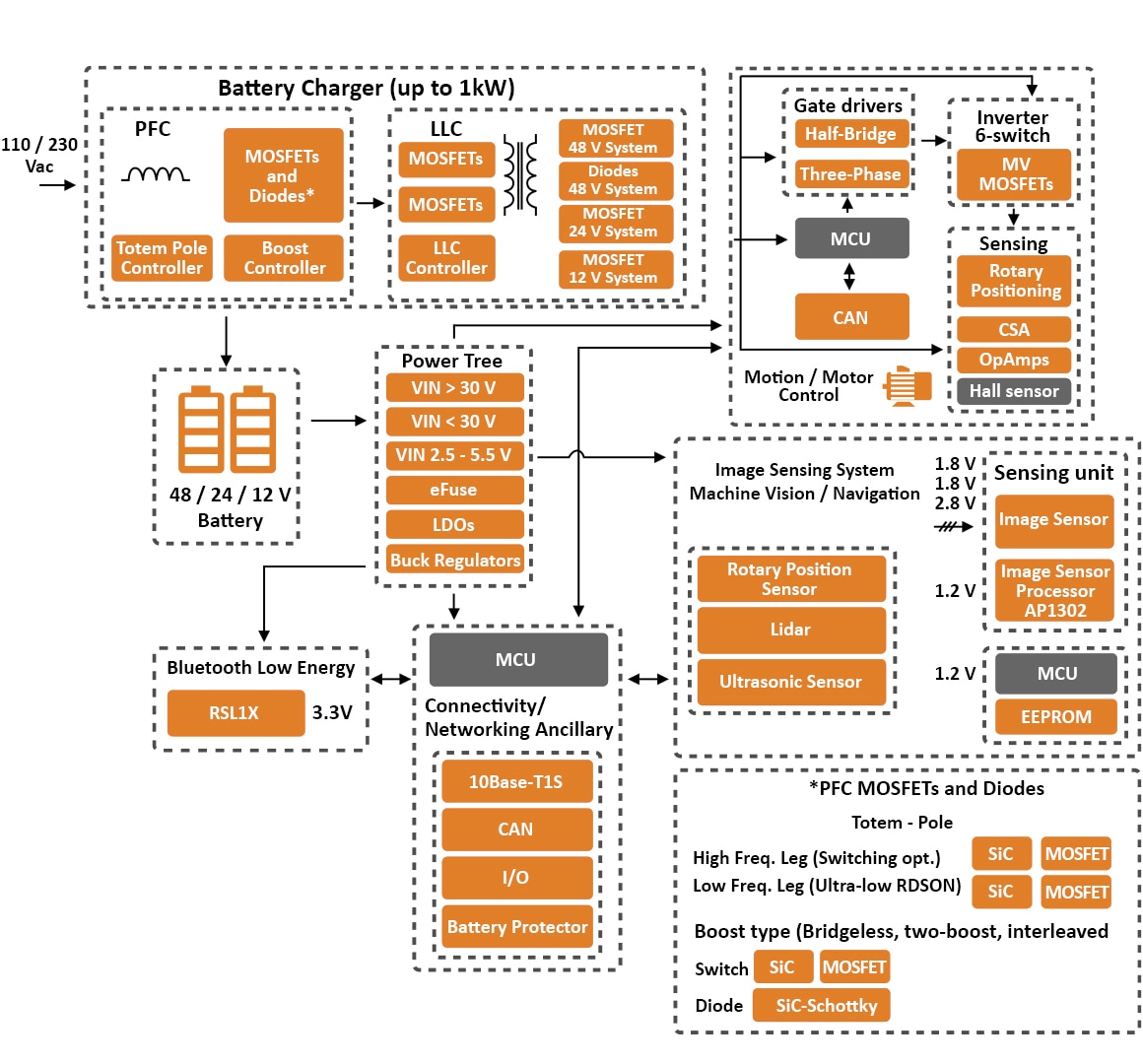 The onsemi Autonomous Mobile Robot concept is a comprehensive robotics solution designed with highly efficient and innovative solutions from onsemi. The concept can be used to design various types of Robots, Cobots, Power tools and Autonomous Guided Vehicles by combining different intelligent and power solutions from onsemi.