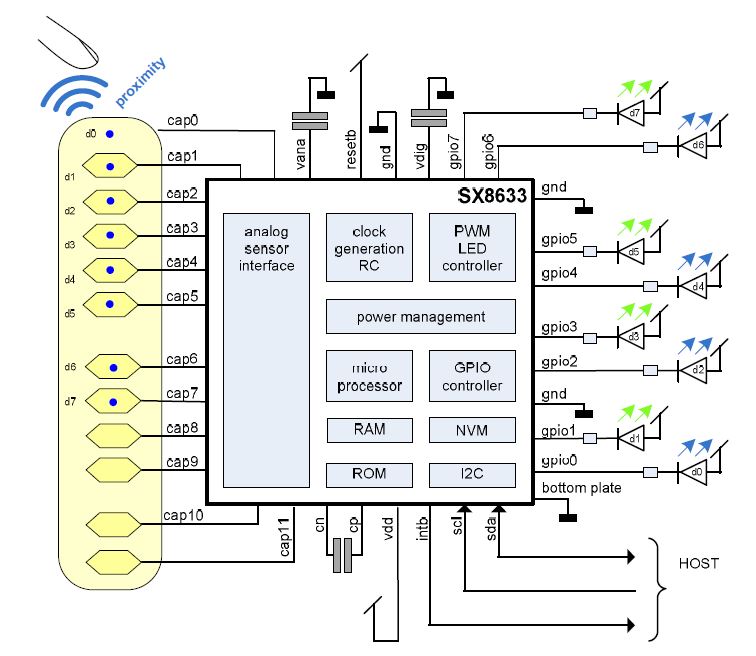 Semtech offers the SX8633 low-power capacitive button touch controller with 12 sensors and enhanced LED drivers and proximity sensing