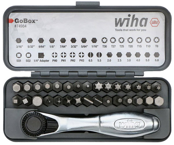 Wiha's 32 piece GoBox Torx Plus bit set with mini ratchet comes in a pocket-sized metal housing for easy storage and tool security