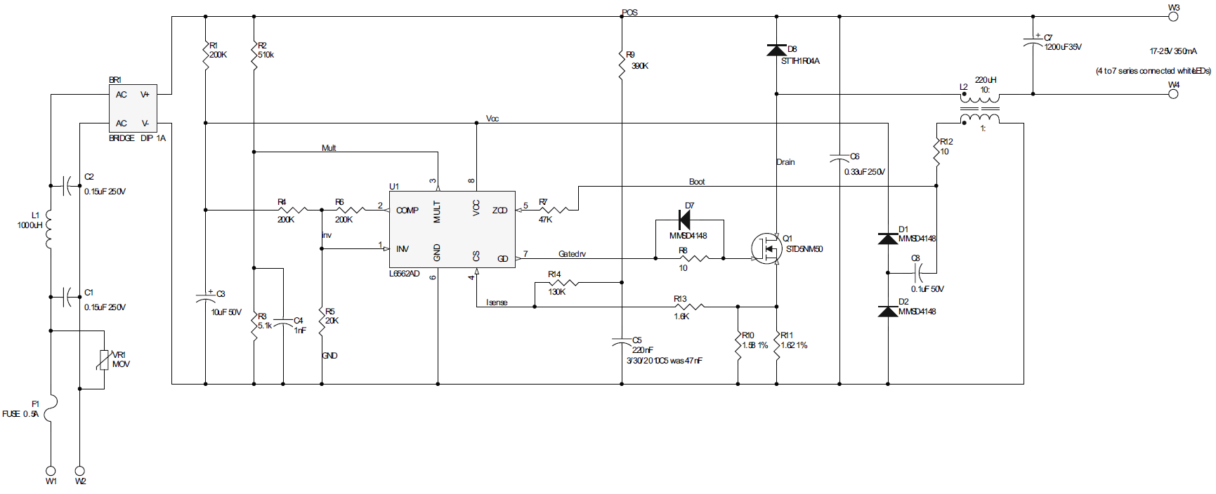 The coupled inductor has a step-down winding to power the L6562A PFC driver.