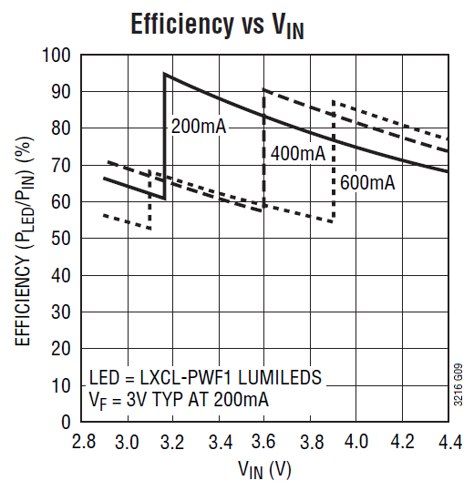 >80%, 3.6 ~ 4.1V in @ 400 mA >80%, 3.15 ~ 3.75V in @ 200 mA |